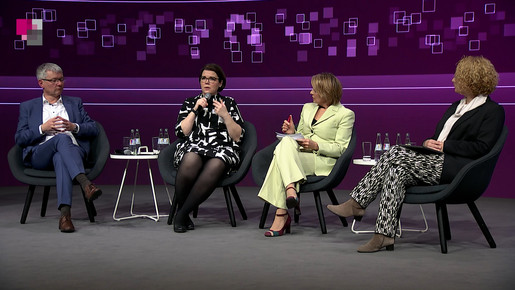 Prof. Dr. Dirk Messner, Präsident Umweltbundesamt, Klaus Müller, Präsident der Bundesnetzagentur, Dr. Nina Scheer, Klimaschutz- und energiepolitische Sprecherin der SPD-Bundestagsfraktion, Ralph Tiesler, Präsident des Bundesamtes für Bevölkerungsschutz und Katastrophenschutz, Moderation: Anke Plättner