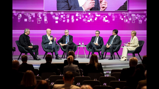 Diskussion zur Haushaltspolitik: Prof. Marcel Fratzscher, Ph.D., Präsident des Deutschen Instituts für Wirtschaftsforschung (DIW), Dr. Marcus Optendrenk, MdL, Minister der Finanzen des Landes Nordrhein-Westfalen (CDU-Fraktion), Dr. Thorsten Rudolph, MdB, Mitglied im Haushaltsausschuss (SPD-Fraktion), Christian Haase, MdB, haushaltpolitischer Sprecher der CDU/CSU Fraktion, Andreas Hemsing, stellvertretender dbb Bundesvorsitzender